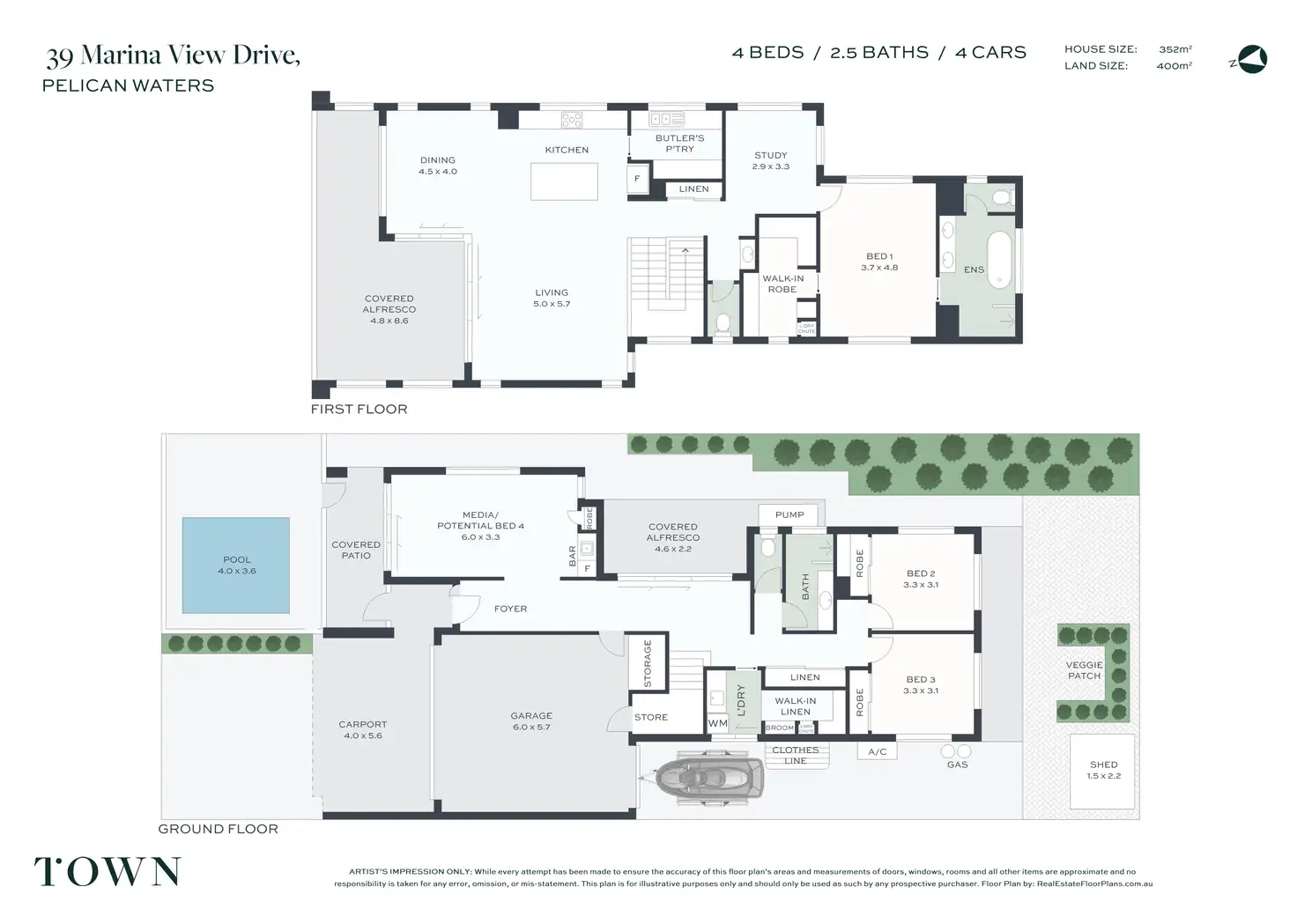 Across two expansive levels the home comprises formal entry, four bedrooms, two fully tiled bathrooms plus powder room, study, two separate living areas (one on each level), sleek designer kitchen with butler’s pantry, upper covered alfresco terrace, private east facing terrace on ground level, covered front patio overlooking heated saltwater pool, separate laundry, double lock-up garage with storage and drive-through access for boat/trailer, plus double carport.