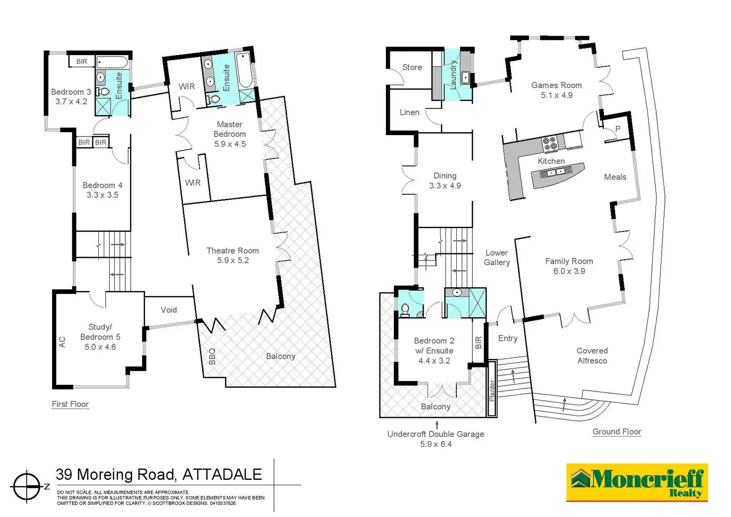 The second "mezzanine" floor has a powder room and a carpeted 4th bedroom with built-in wardrobes, views of the city, river and Santa Maria College sporting facilities and a fully-tiled ensuite bathroom with a shower and stone vanity. On the third floor, you will find the 2nd and 3rd minor bedrooms with carpet and built in robes (and a desk to the 3rd bedroom), a main family bathroom with a separate bath, shower, toilet, heat lamps and a stone vanity, a theatre room with speakers, bi-folding doors that lead out to an alfresco balcony with a stone kitchenette, city, river and school views and tiled flooring and a carpeted master bedroom suite with double doors, separate walk-in robes, a fully-tiled ensuite bathroom (with a shower, spa bath, twin vanities, a toilet, heat lamps and down lighting) and double-door access out on to the balcony for more views.