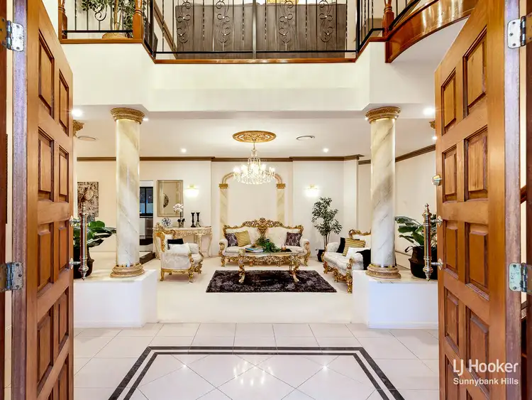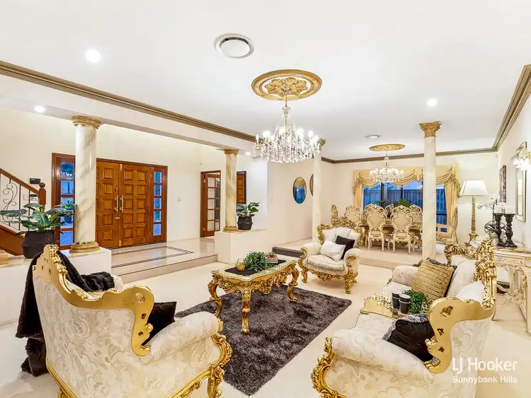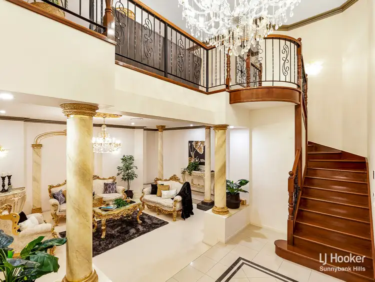 Upon entry, the foyer boasts a glorious double door of rich timber and glass, soaring high 2-storey ceilings, a grand staircase, beautiful glossy porcelain floors and a plush sunken formal lounge that showcases stunning gold ceiling roses, grand pillars and an exquisite formal dining platform. This space is very impressive and sets the scene for the rest of the house.