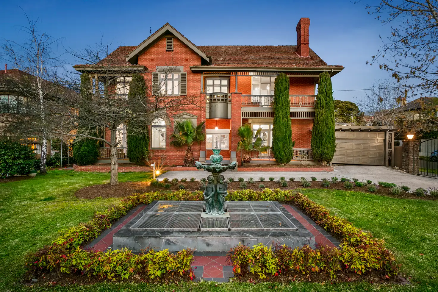 Grand c.1907 solid brick Arts and Crafts Federation era home on 1047sqm corner parcel offers substantial five bedroom plus study, three bathroom accommodation with soaring ceilings, open fireplaces and rich period detail, large formal and family rooms, multiple alfresco terraces, lift, second story city skyline views and landscaped gardens.