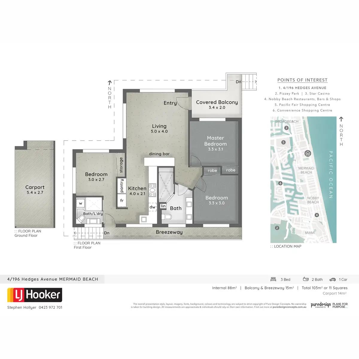 140m to Mermaid Beach Surf Club and Cafe on Hedges Ave, a short walk to many top class local restaurants, bars and cafes. 500m to Broadbeach State School. Buzzing hub of Broadbeach is close by only 1.2km from your front door. Pacific Fair Shopping Centre 1km. Jupiter's Star Casino 1.2km. Surfers Paradise 7 minutes� drive North. Coolangatta airport 20 minutes to the South.