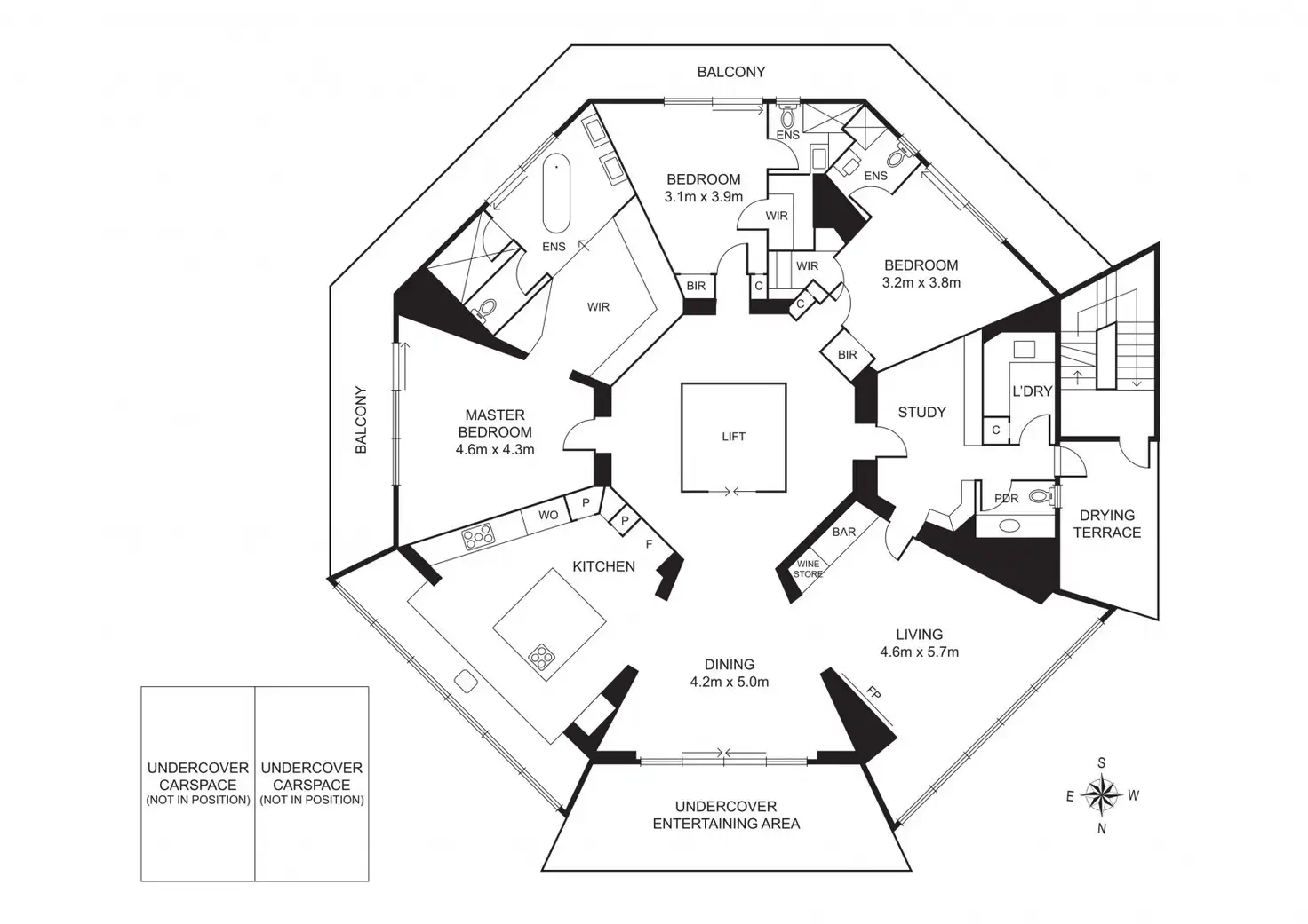 Melbourne's CBD skyline delivers the perfect backdrop to the expansive living and dining rooms where an ambient electric fireplace, centrally-placed bar, and built-in LCD TV ensure a relaxing environment to unwind. Drenched in northern sun and guarded from wind, the outdoor entertainment lounge is the perfect extension to internal dining, offering a custom outdoor barbecue kitchen and lengthy bar seating. The latest Bosch appliances are showcased within the kitchen and laundry, including gas and induction cooktops, convection microwave, and coffee machine, encased in dazzling contrasting textures of gloss, stone and mirrors, offering extravagant storage and implausible space.