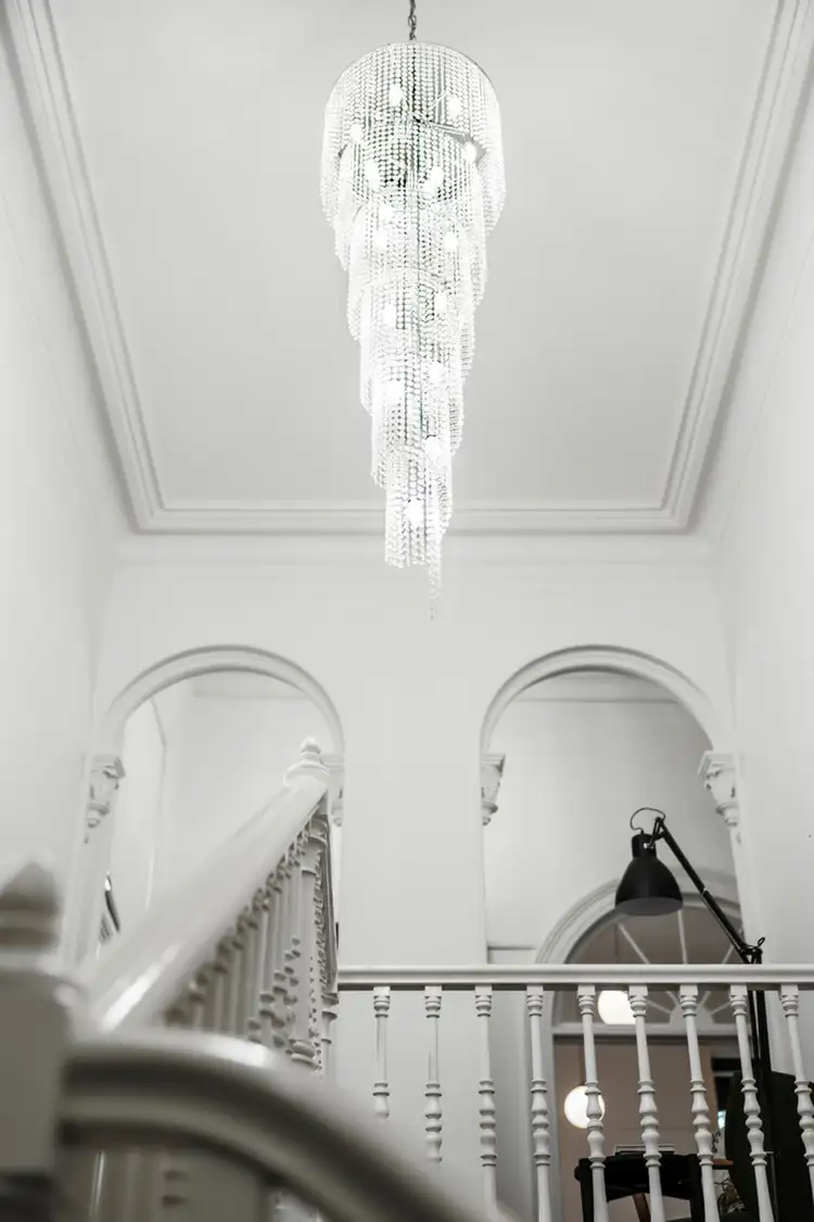 It begins with a private ground-floor entry foyer with tessellated floor tiling and a carved timber-balustraded staircase lit by a stunning spiral chandelier.