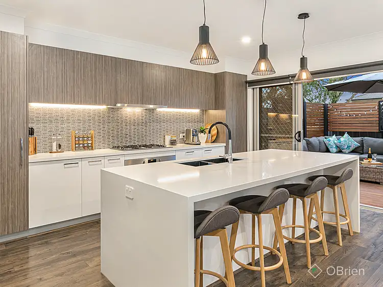 At the rear of the home you will find the well-presented open plan kitchen/living and meals area - oozing with style everywhere you look, from the ash tones of the floating timber floors to the naturally light filled spaces that make up the living/kitchen and dining. Perfectly positioned to take in all that is the entertainers deck and landscaped gardens that awaits outside. The Chef's kitchen featuring, 900mm oven, dishwasher, beautiful Caesar stone benchtops including a huge island bench, pendant lighting, modern tapware, plenty of gloss white cabinetry, gas cooktop, and feature tiled splashback with extra strip lighting, all whilst overlooking the other zones so you can always be in the mix while cooking and entertaining.