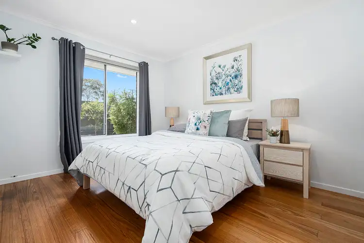 Beautiful solid timber floorboards line underfoot throughout, large sunlit windows with double block-out/privacy blinds, a fresh colour palette, split system air-conditioning, and an adjoining single garage with courtyard access, plus additional parking in front.