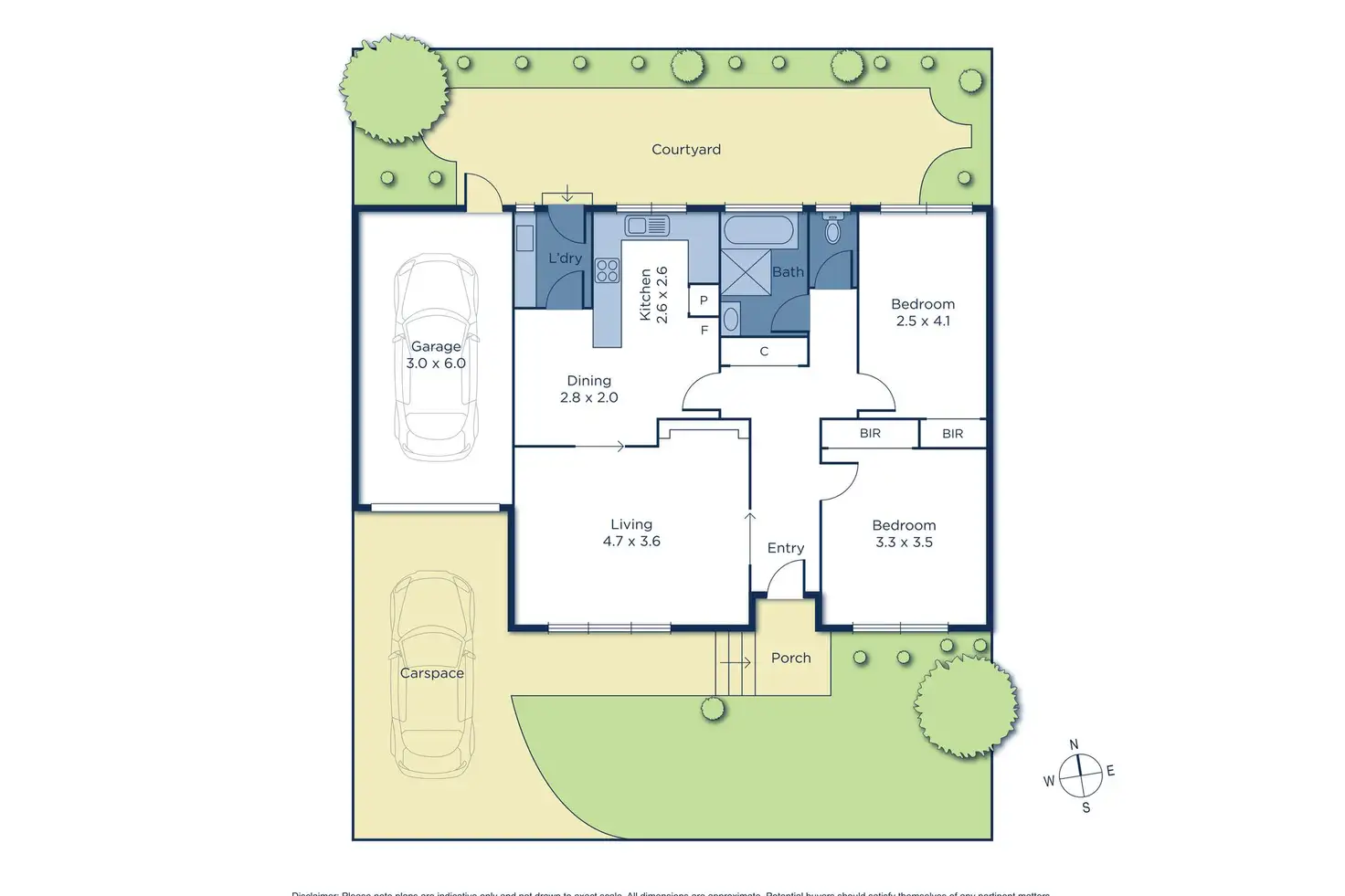 A laundry with timber shelving grants access to outside, where there is a paved north-facing courtyard to alfresco dine or enjoy quiet time in the sunshine.
