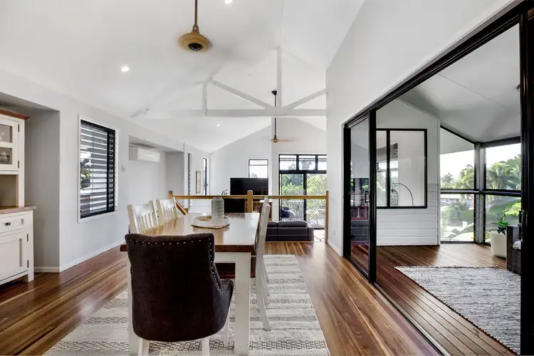 - Hardwood staircase upon entry, you're greeted by the grandeur of the open-plan lounge and dining area, raked high ceilings, polished timber floorboards, strategically placed window shutters to capture refreshing breezes and supplemented by air-conditioning.