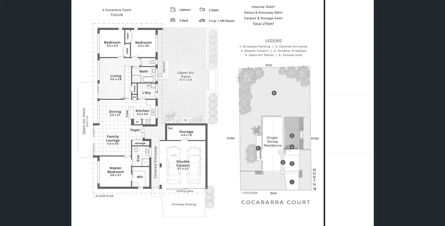 The block is 1094 m2, 25mt frontage x 44.2mt deep, slight fall from right to left, house is a simple Brick and Tile design, with a contemporary French lime wash finish which can be concrete rendered easily. There are 3 bedrooms, main bathroom & separate toilet PLUS a second large living room 5.0x3.8mt & large linen cupboard. Master Bedroom has a large walk in robe and En Suite , Garage 5.7x5.3m with an additional Storage room, there is heaps of potential to extend the open plan kitchen and lounge room with storage cupboard by joining to the oversized laundry, extensive outdoor paved courtyard with BBQ area, alfresco bar and outdoor fireplace.