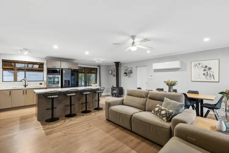 The heart of the home features three spacious bedrooms, each with built-in robes, and a well-appointed central bathroom. The master bedroom is a spacious retreat, while the other two bedrooms provide ample space for family or guests. The home is designed for year-round comfort, with ceiling fans throughout, a combustion heater for cozy winter evenings, and a split-system air conditioner for those warmer months.