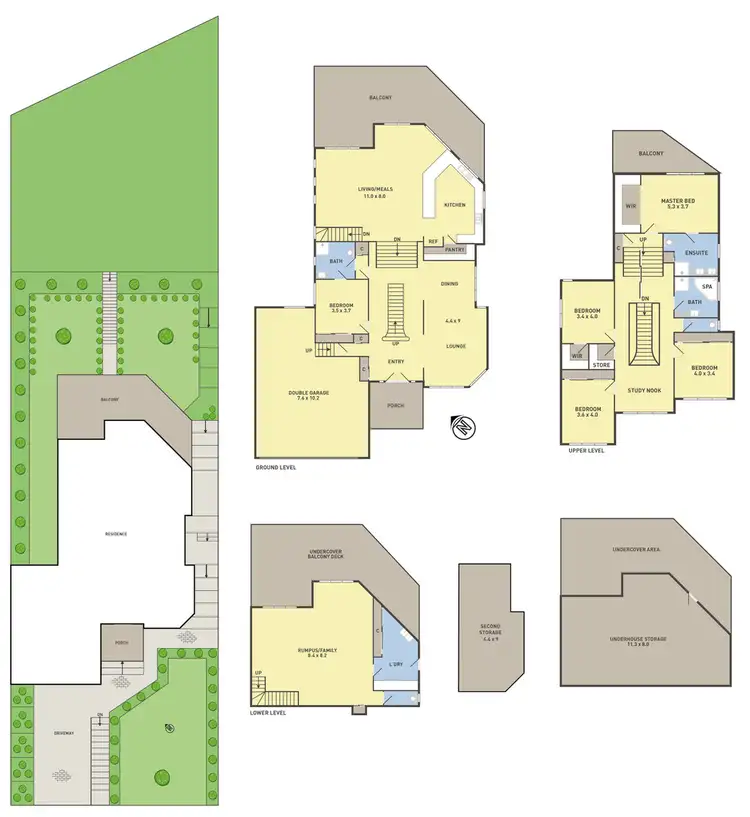 Structurally, you simply won't find better, comprising of 5 dedicated bedrooms + study area, master with retreat + ensuite + walk in robe + balcony , 2nd master bedroom on the ground level with a private ensuite, 4 separate living quarters, theatre/lounge + dining + activity/rumpus + living + family & meals + alfresco & terraces. Boasting Jarrah hardwood floors and quality plush carpets, stone Granite benches, high ceilings with decorative cornices,skirting & architraves, ample storage throughout the entire home, zoned heating + refrigerated cooling + central vacuum system + visual intercom + laundry chute + solar electricity + full network cabling + grand timber staircase finished in wrought iron with a 20ft ceiling void oozing opulence + a triple car remote controlled garage with internal access ...