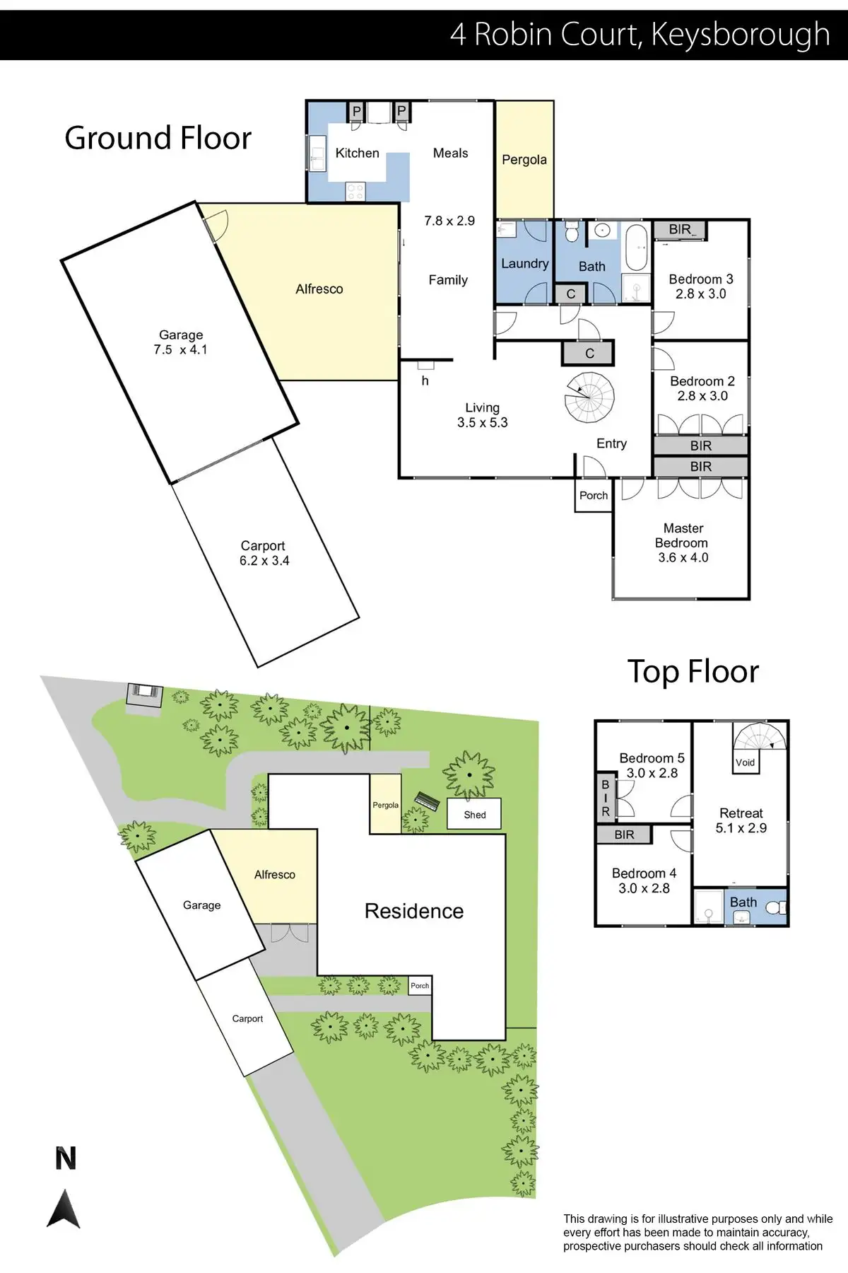 Moving further along, you’ll discover a large laundry with courtyard access, a central bathroom with bathtub and shower cubicle, and three generously-sized bedrooms with built-in robes. Two additional bedrooms can be found to the upper level, alongside a second bathroom and versatile retreat that makes an excellent kids’ play area, rumpus or home office space.