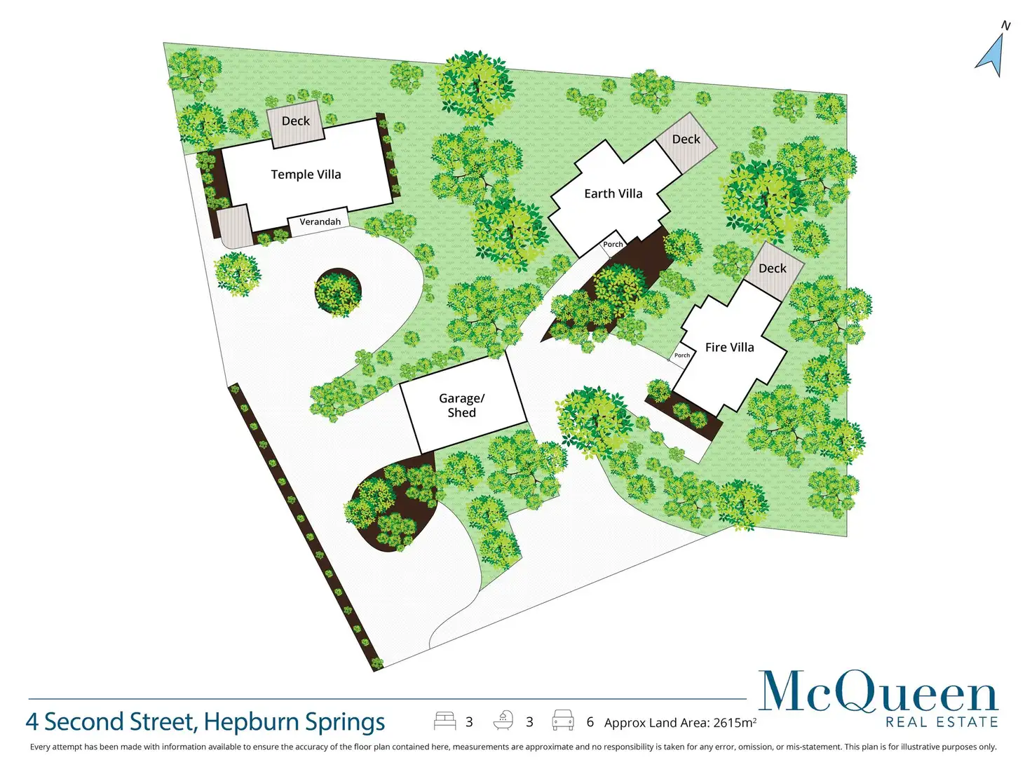 Earth and Fire present similar, mirrored floorplans. The living room comes with an open woodfire, woodfire storage and built in cabinetry, while the kitchen features a stone benchtop and a suite of appliances including an induction cooktop, microwave, oven and integrated dishwasher and fridge. The primary ensuite bedroom is complemented by an attic bedroom with a day bed. Private decks open to provide gorgeous vistas of the surrounding scenery. Temple is the largest with a sunken spa and outdoor bath. Includes gas ducted heating, split system air conditioning and heating to the main living zone. A 9m x 6m (approx.) garage with storage racks and circular drive complete the layout.