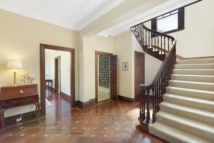 pillared portico entry leads to the reception hall with parquet timber floors and grand staircase