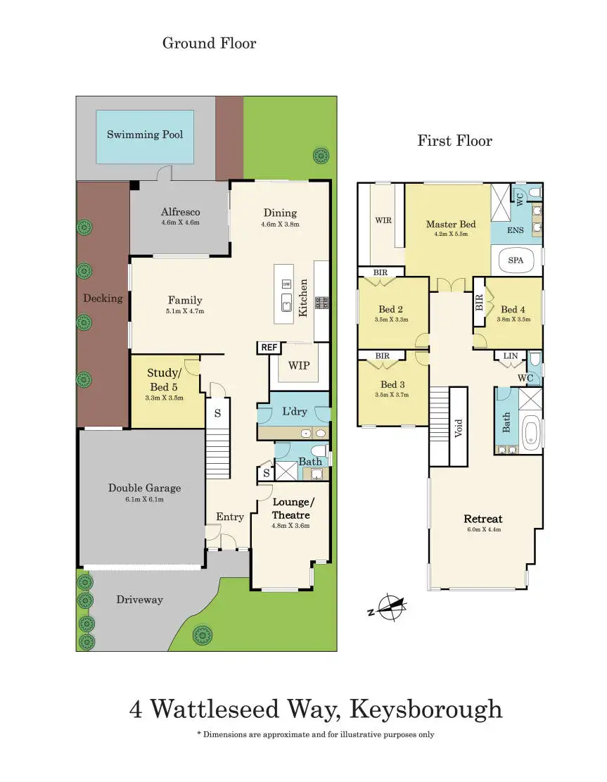 Arrive at an exposed aggregate driveway leading to a remote-controlled double garage with secure internal entry. Inside, the formal living room provides the perfect retreat, while the ground-floor study/fifth bedroom offers flexibility for guests or extended family, with a bathroom conveniently next door. The heart of the home is the grand kitchen, complete with a central island breakfast bench, walk-in pantry, dishwasher, 900mm oven, and a 5-burner cooktop. Flowing seamlessly into the open-plan living and dining areas, it extends to the undercover alfresco deck - excellent for relaxed entertaining. Enjoy the solar-heated pool while still having lawn space for kids and pets. Upstairs, a versatile additional living area complements three bedrooms with built-in robes, a central bathroom, and the luxurious master with a walk-in robe and ensuite. Additional highlights include under-stair storage, lush gardens, a spacious laundry, plantation shutters, a garden shed, tinted windows, and a ducted vacuum system.