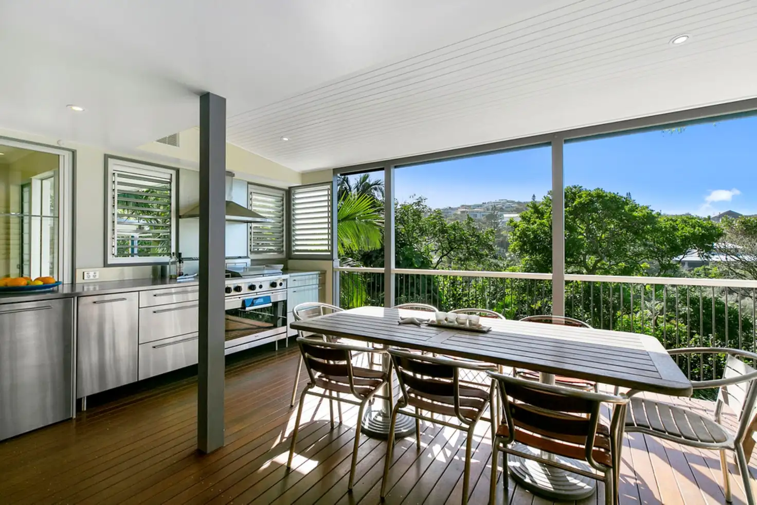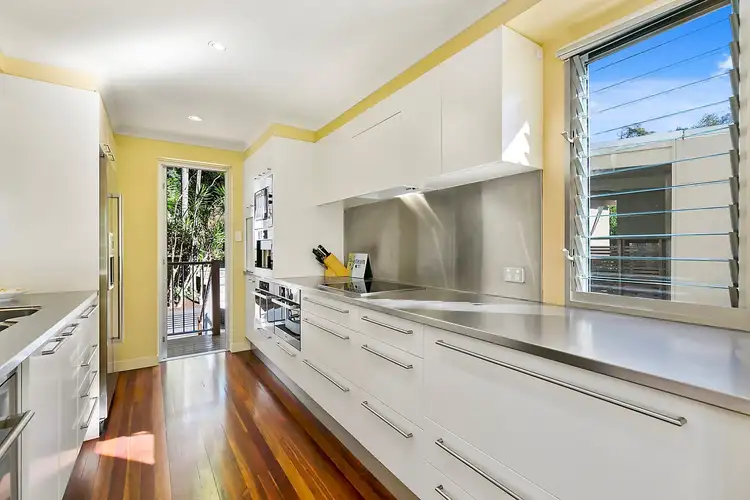 Split-level, it is complete with entry foyer, four bedrooms, three bathrooms, office/sitting room, well-equipped kitchen with stainless steel Miele appliances, two separate living areas, two large timber decks the main with commercial-grade stainless steel outdoor kitchen, and double lock up garage on 608m2 block with verdant tropical vegetation.
