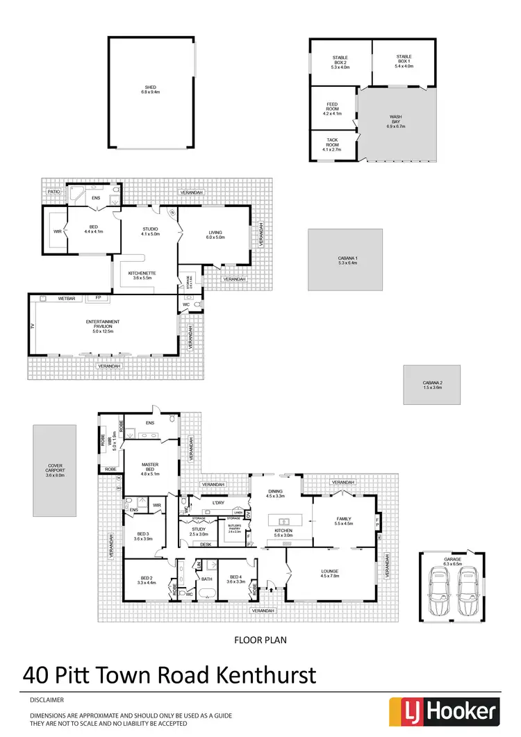 Detached 2 car garage, 10m x 7 metre brick shed with industrial roller doors - accommodates 3 cars, Stable complex with 2 stalls, feed room, tack room and wash down facilities