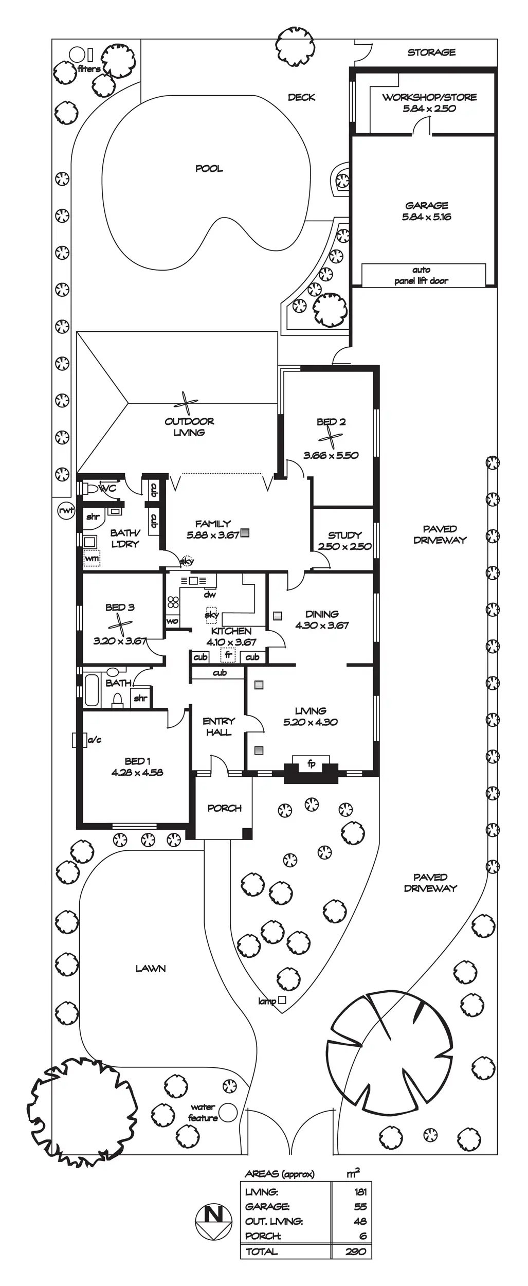 A large double garage with automatic panel lift door will accommodate family vehicles, while an adjacent workshop/storage area offers a spacious utility area. There is plenty of room to park your recreational vehicles in a long paved driveway, bordered by manicured gardens and established landscaping.