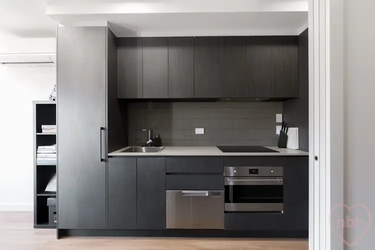 Intimate foyer, European laundry and sleek bathroom welcome a sumptuous modernity, and a considered materiality that includes washed black oak, natural stone and ceramic tiling in a mix of organic hues. Beyond the hall is a sun drenched social arena, where swathes of dark framed glass welcome views, extending the living space to sheltered balcony. Pocket sliders can be opened or closed to dramatic effect, revealing or privatising the large bedroom, with its wall of sleek mirrored robes, soft carpeting and fixed window welcoming an ambient natural light.