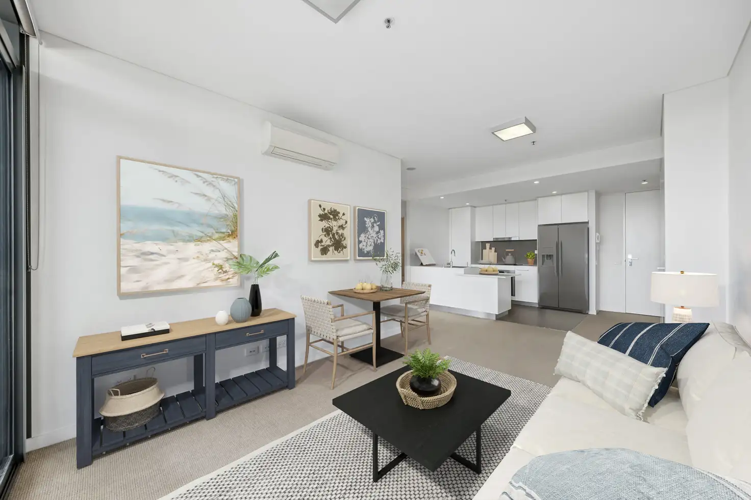 - Light-filled open-plan kitchen and living area, flowing seamlessly onto the balcony through glass sliding doors