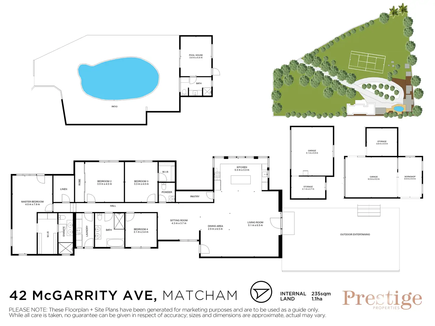 - Multiple garaging and storage sheds (approx. 5.8 × 5.8 m and 10.0 × 5.6 m) plus a dedicated workshop area.