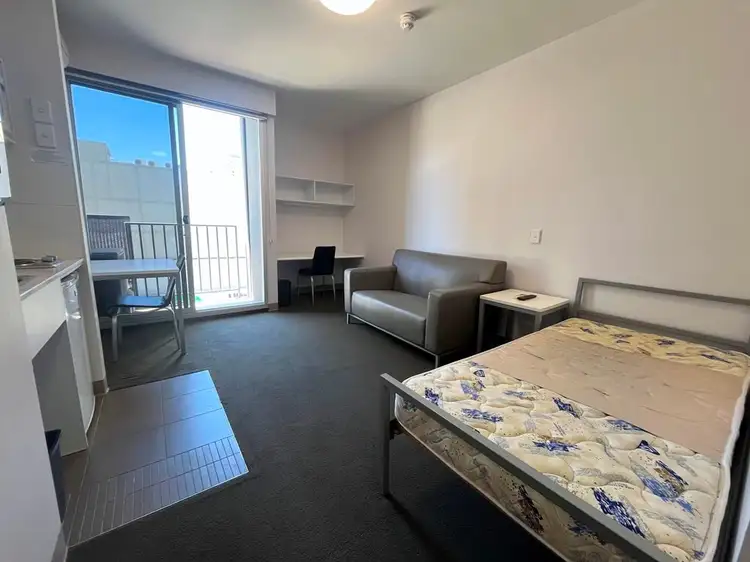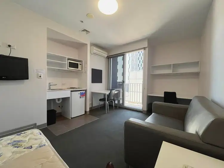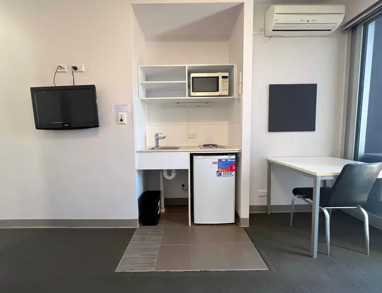Designed for comfort and functionality, each apartment features an open-plan living and dining space with high ceilings, a well-equipped kitchenette with a cooktop, microwave, and fridge, and a modern bathroom. A built-in study desk and shelving provide a practical workspace, while a private east-facing balcony offers city views. Reverse cycle air conditioning ensures year-round comfort, and a wall-mounted TV adds to the convenience.