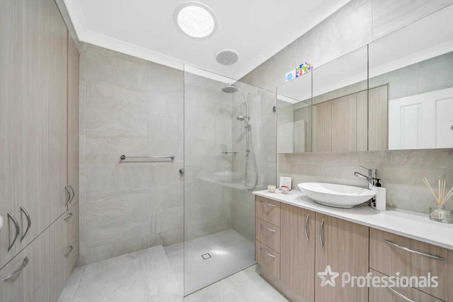 The main bathroom, also fully renovated, complements the ensuite with its clean, neutral lines, skylight, mirrored cabinetry, floor to ceiling tiles, double showerhead, and so-much-storage!