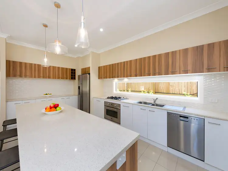 Kitchen features include Stone Bench Tops, Tiled Floors, Walk In Pantry, Island Bench with Feature Lighting, power and Breakfast bar, Gas Cooktop, Rangehood, Dishwasher and ample preparation space.