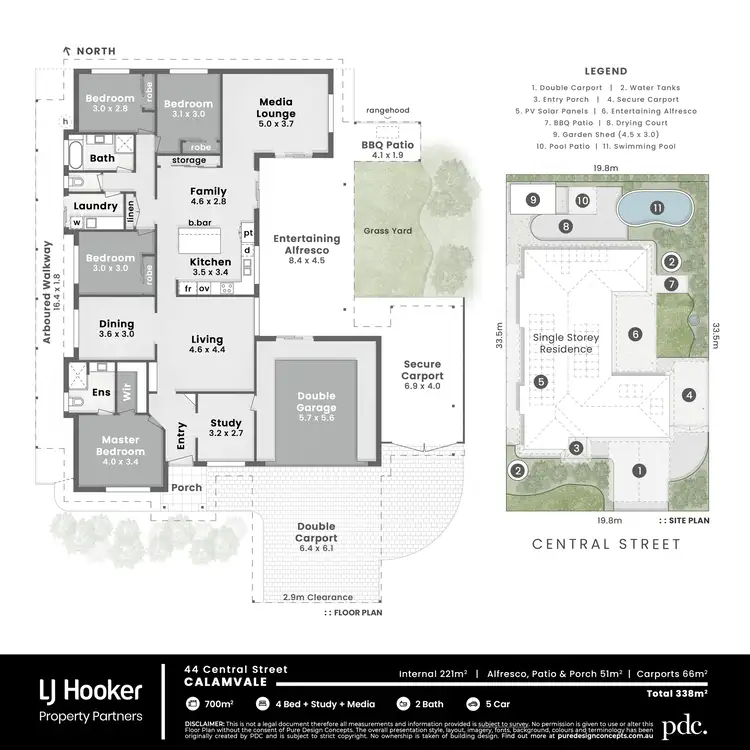 Street-side, manicured lawns and neat gardens contained behind solid retaining walls, lie either side of an attractively paved driveway rising to the double carport and a remote entry 2-vehicle garage. The single side carport (and the garage) both access the central yard where lawn and tropical plantings embrace the fully covered, fan-cooled entertaining patio and a dedicated BBQ area with a stainless rangehood. Out back, playful checkerboard-patterned paving connects the pool to a cute party hut and garden shed, while an arboured walkway runs down the western boundary.