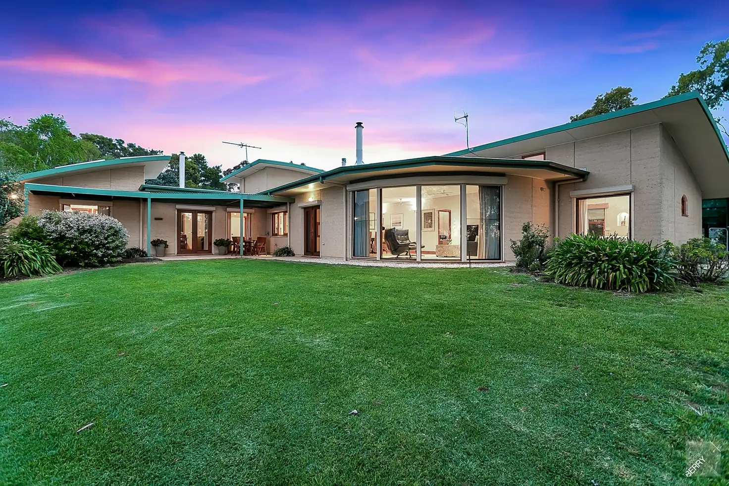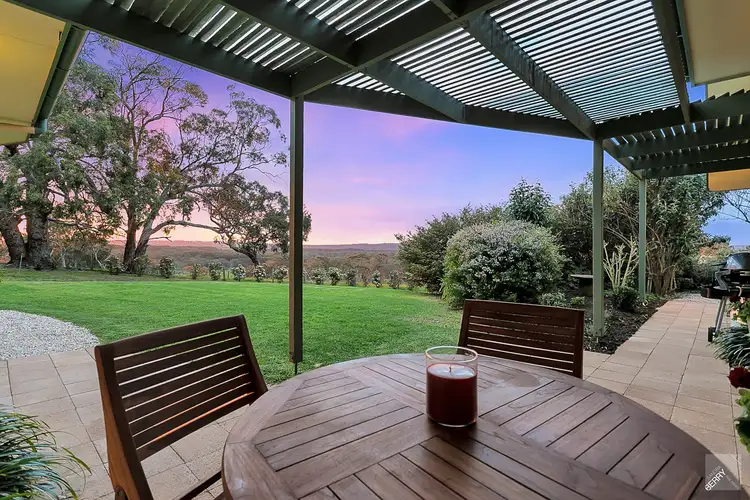 Large picture windows with scenic views across the garden, surrounding paddocks and Mt Lofty Ranges