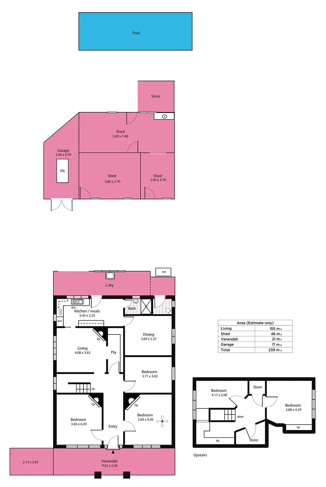 Upstairs, you'll find storage cavities and two of the five bedrooms. Beyond the residence (and in a state of some disrepair) is a pool, a series of joined sheds and a workshop/garage with a pit.