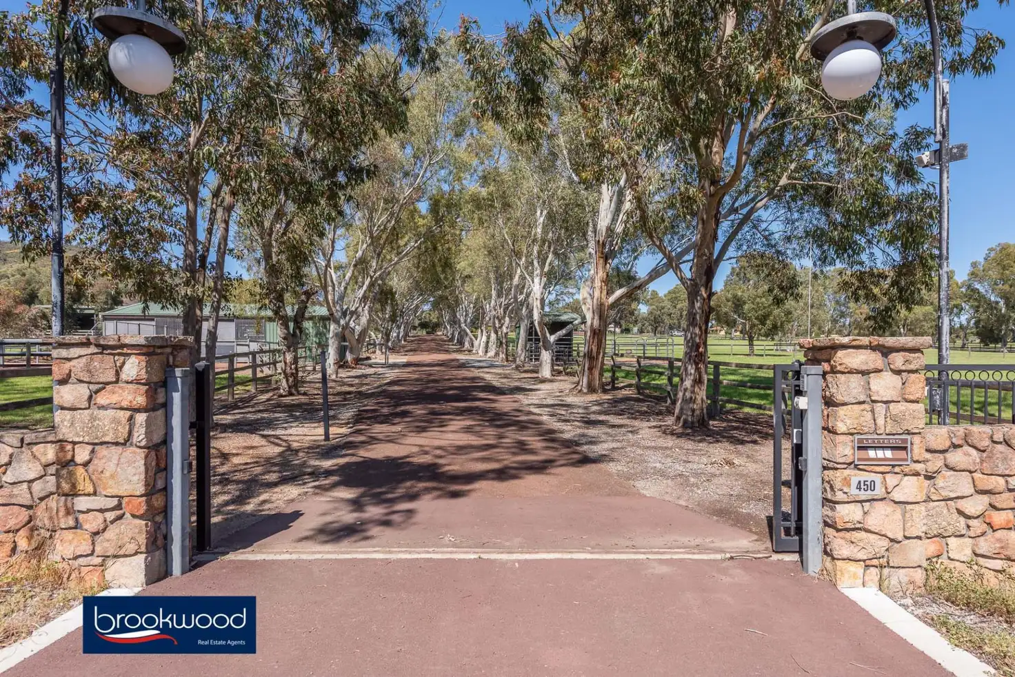 An Avalon stable block with two foaling boxes, large yards and two open stalls, a tack/feed room with lights, a second wash bay and automatic water bowls to all stalls, provide additional accommodation. At the western side of the driveway is a stallion box with an automatic water bowl and access to a large paddock. All twelve paddocks have automatic water bowls and electric fencing. A rubber-lined, 16 m post and rail round yard sits to one side of the arena complex.