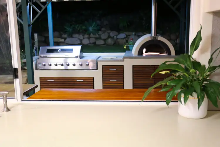 • Outdoor kitchen area with huge stainless steel gas bbq, built-in wood fired pizza oven and servery window into the indoor kitchen