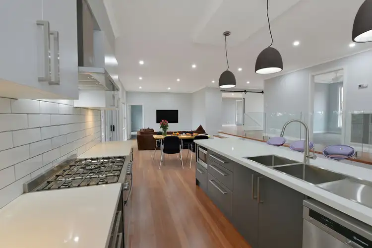 Stepping down 2 steps to the central hub of the home, you have a huge open plan kitchen, dining and lounge area. With a large island bench, pendant lighting, stainless steel appliances, and walk in pantry, this stunning kitchen it is the perfect size for the growing family! The generous living space provides a perfect place for relaxation and offers a seamless flow to the covered outdoor entertaining area & master bedroom. The master is a great size, with a walk-in robe + ensuite, this room overlooks the rear yard and is positioned conveniently away from the other bedrooms. Heading outdoors you have large covered merbau deck with timber handrails & balustrading and overlooks the huge rear yard, perfect for BBQs and watching the kids play.