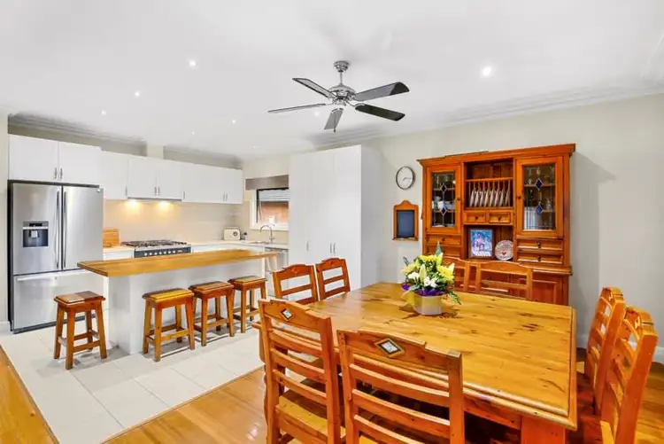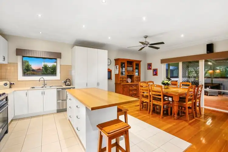 Flowing effortlessly the warm tones of the polished floorboards lead you towards the living spaces at the rear of the home. This generous family zone with large windows creates an inspiring connection to the lush gardens, completely visible from the impressive kitchen. Showcasing island bench with breakfast bar, white easy-care laminate cabinetry, plenty of bench space, free standing 900ml gas cook top and oven plus double drawer dishwasher, whilst still retaining a sense of country charm.