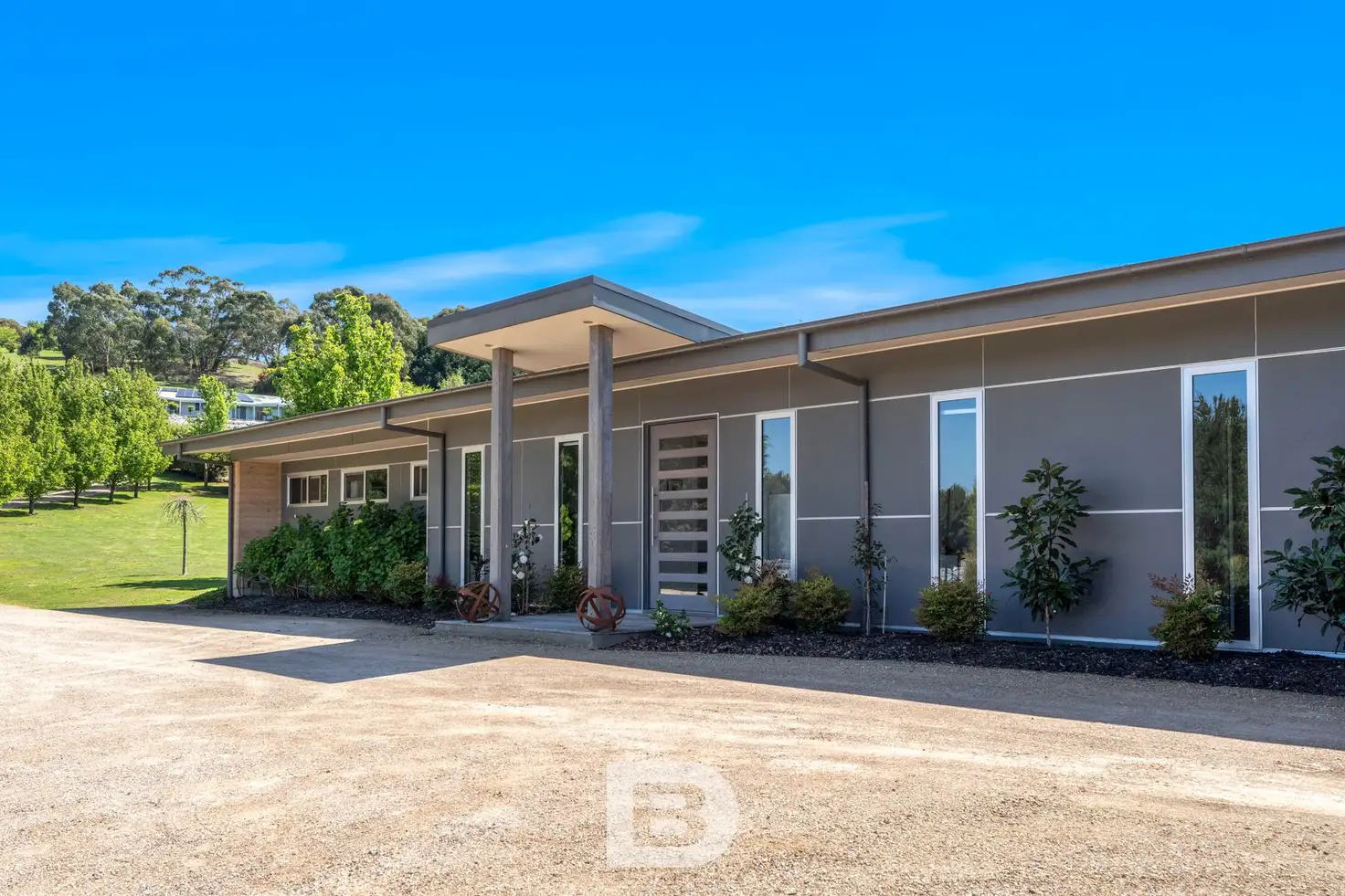 This four-bedroom home offers exclusive country style living in New Gisborne, the perfect entrée to the Macedon Ranges. From the moment you enter the driveway lined with pear trees (framed by lights in the evening) you know you are about to come home to something special. The house is in a peaceful environment surrounded by greenery and landscaped gardens that provides privacy and plenty of space to play in and enjoy.