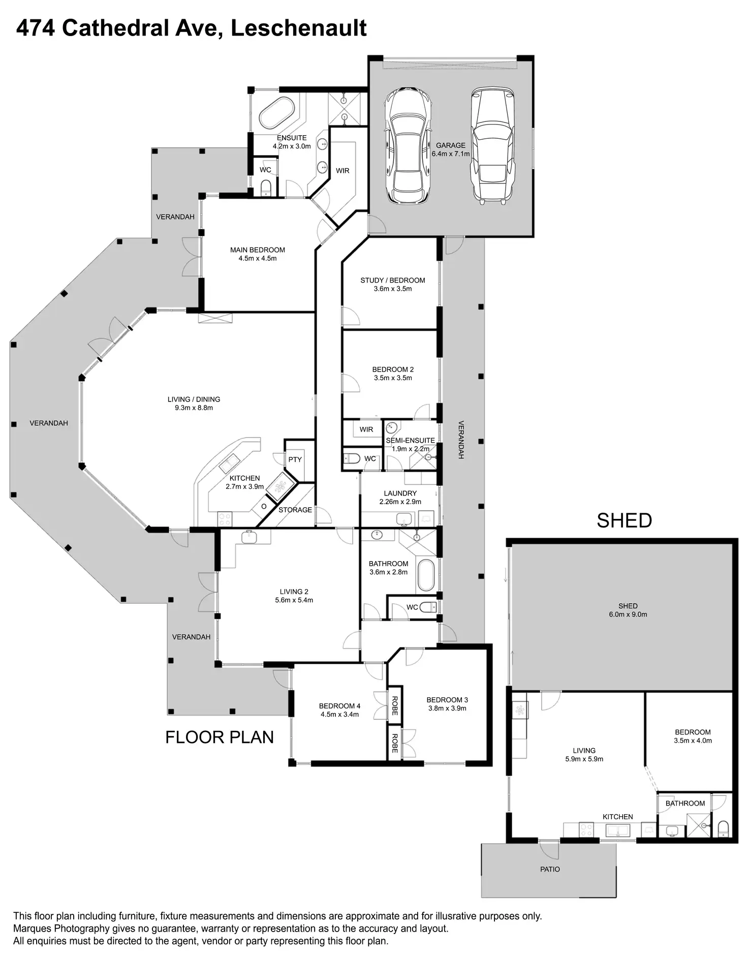 • 100m² shed divided into two sections, one with two bays for parking or storage, the other also for storage or an outside games room which is A/C and equipped with a bathroom and toilet.