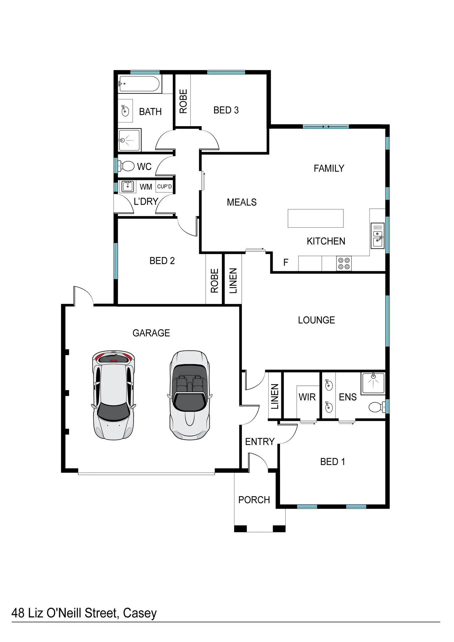 Spacious and bright, the master bedroom, segregated at the front of the home, is complete with a walk-in robe and ensuite with dual sinks. The 2 remaining bedrooms, both with built-in robes, are located at the rear of the home along with the main bathroom and separate toilet.