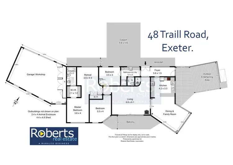 Outside, a substantial garage has room enough for two vehicles and a workshop besides, and plentiful storage. A large carport provides additional undercover parking and houses a number of solar panels on its roof. Outbuildings include a decently sized shed, and animal enclosure.