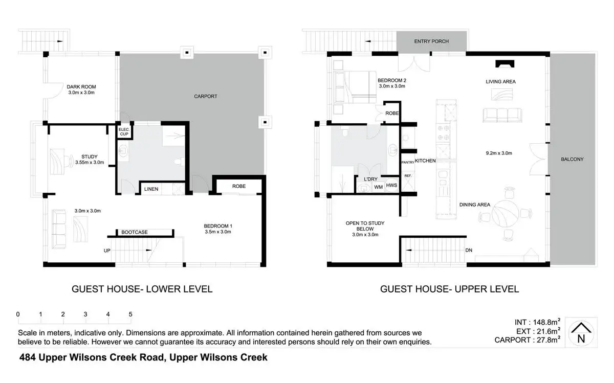 Although of a different configuration to the main house, the guest house shares the same "treehouse" design elements. With two internal levels to provide privacy and comfort, there is an enclosed wood burning stove providing warmth in winter, plus there are plenty of adjustable louver windows to allow cross flow for coolness in summer.