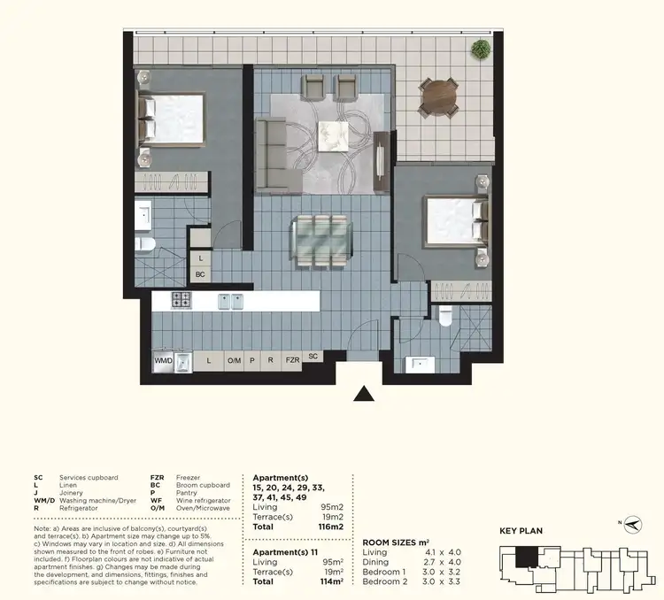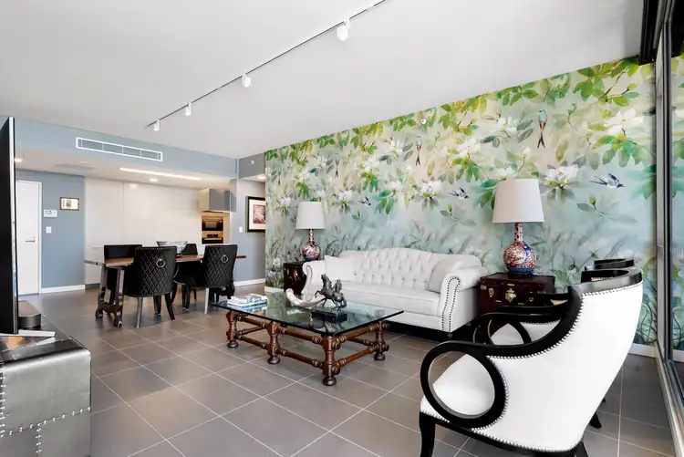 Situated on the 13th level, this spacious 116m2 residence offers a contemporary open-plan layout that seamlessly blends style with functionality. Step inside to discover newly renovated bathrooms and a captivating Designer Guild wallpaper feature wall, complemented by an oversized kitchen adorned with top-of-the-line Miele appliances.