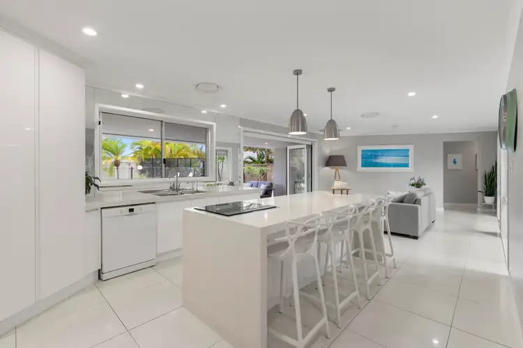 As you step inside, you'll be greeted by cathedral ceilings giving the home an abundance of natural light and character. There is an open and airy floor plan that seamlessly connects the living, dining, and kitchen areas. The home is complete with ducted air-conditioning to assist when the cooling breeze is absent. The kitchen with a waterfall stone island bench, induction cooktop and quality appliances is the centre piece for meeting guests as they arrive. Leading out through the family room, bifold doors open up to your private entertaining area and swimming pool.