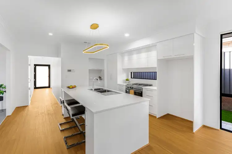 At the heart of the home lies a spacious, light-filled open-plan living, dining, and kitchen zone finished in a crisp, modern palette. Warm timber-style flooring adds an inviting touch, while the gourmet kitchen impresses with sleek stone benchtops, a 900mm gas cooktop and oven, walk-in pantry, and a fully fitted scullery for added storage, prep space and sink. The island bench is as practical as it is stylish, complete with dishwasher, microwave, and breakfast bar - all highlighted by a statement pendant light for a refined finish.