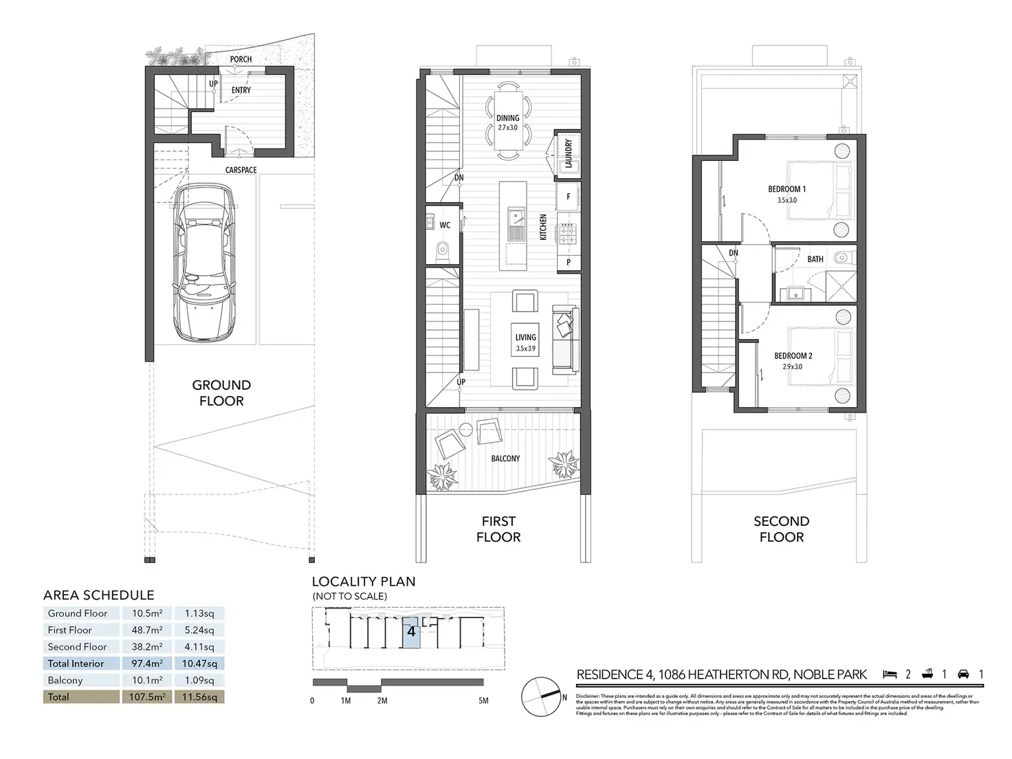Arranged over three levels are well-planned spaces designed for everyday living and entertaining. Light-filled spaces are beautifully accentuated by contemporary wood flooring, balcony views to the first floor, carpeted bedrooms and recessed downlights. Quality kitchen inclusions include stone benchtops, glass splashback and Bosch appliances. Bathrooms enjoy semi-frameless showers, premium tapware and sleek vanity basins. Each terrace is serviced by heating and refrigerated cooling and an alarm system.