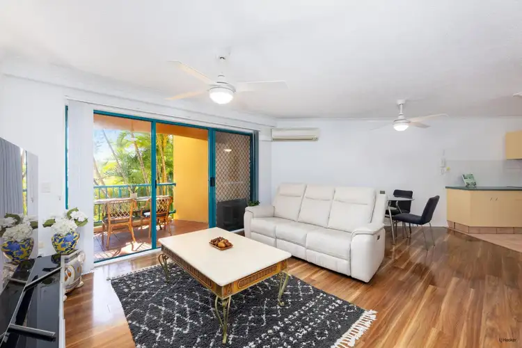 The open plan kitchen has views to the courtyard, plenty of bench and cupboard space that opens out to the open plan living dining area. The lounge and dining also enjoy plenty of light and the large front balcony is perfect for morning coffee and views to the pool through palm filled gardens.