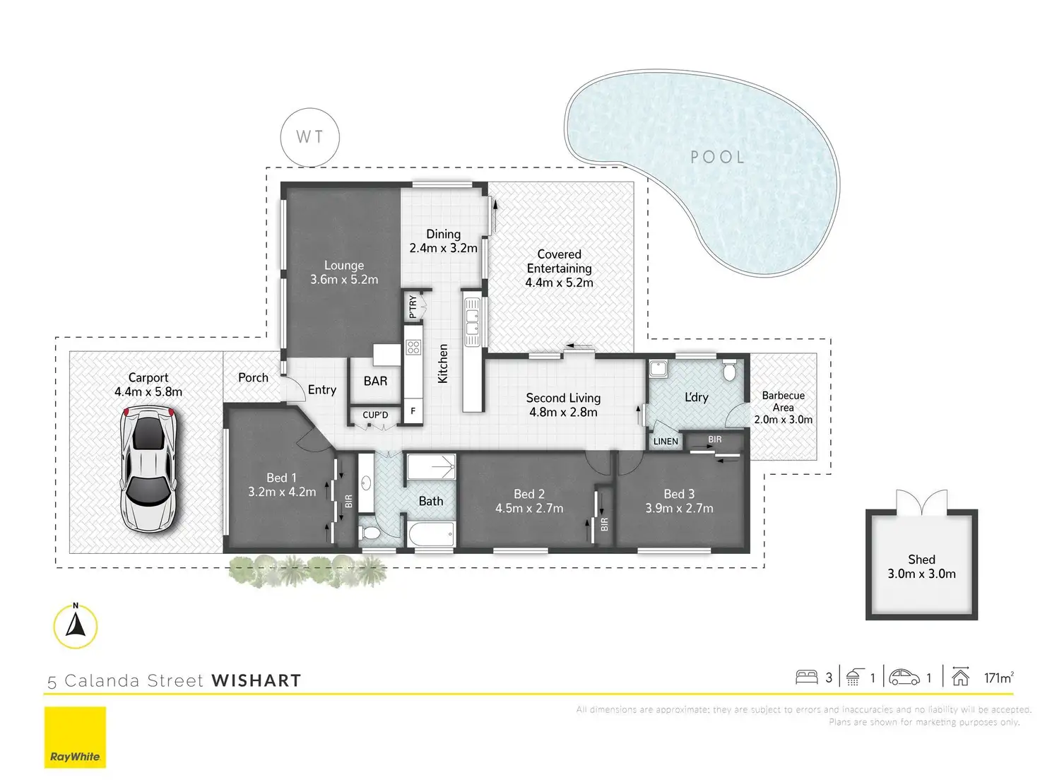 All three bedrooms include built-in robes, and the floor plan features a bathroom, large laundry and covered carport.