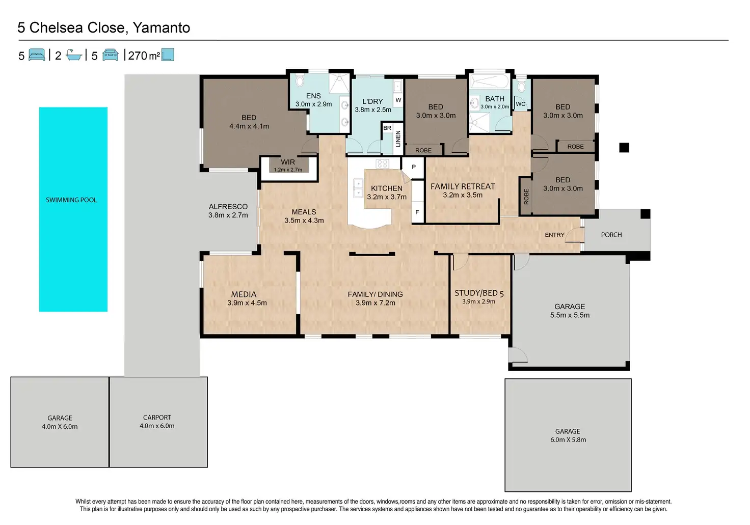A large 5th bedroom/study opens from the entry hall, is carpeted and has ample space to accommodate beds, robes or study desk.