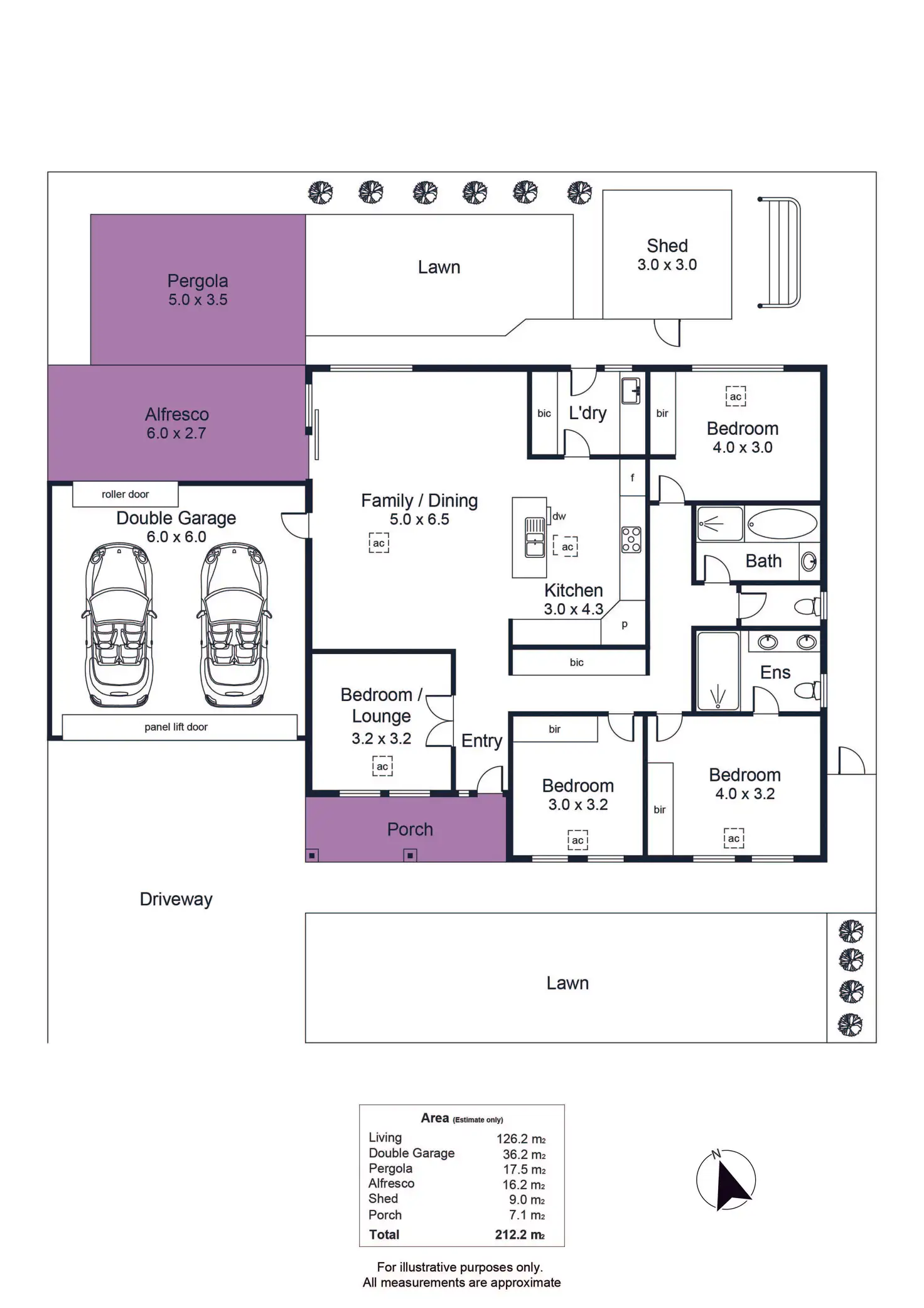 Secure parking is provided by a side-by-side double lock-up garage with an additional roller door opening onto the paved verandah, accommodating up to two extra vehicles in the wide driveway.