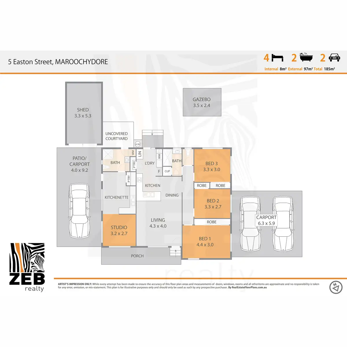 - Cosy gazebo, private courtyard, dual driveways, double carport + single carport