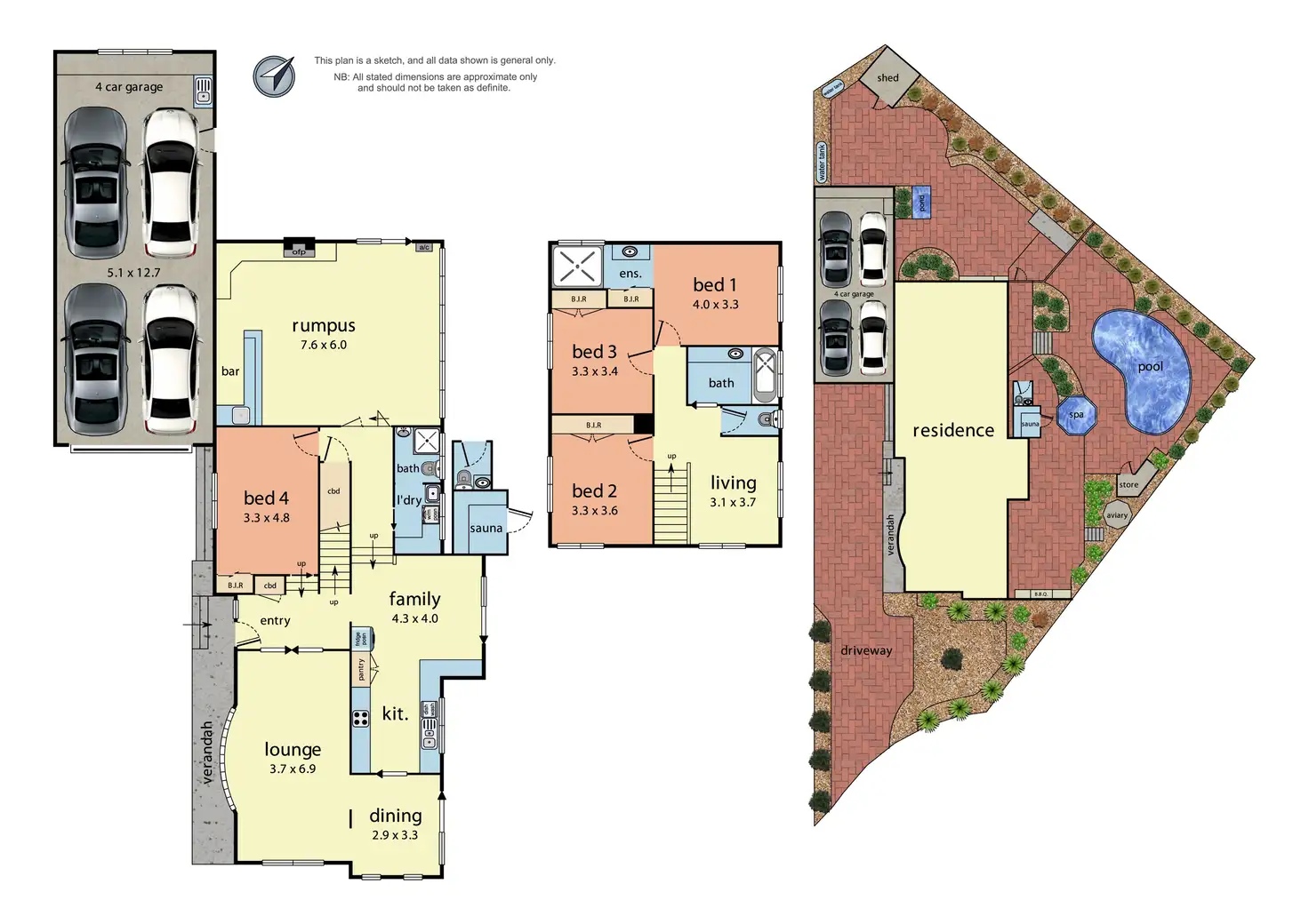 Multiple living zones have the home's occupants covered for every occasion, including an expansive lounge with a connecting dining area, a rumpus with a built-in bar and an open fireplace, and a fully equipped kitchen with a sitting area. All these spaces open to the pool-crowned backyard, complete with a barbeque area, sauna and change room with toilet.