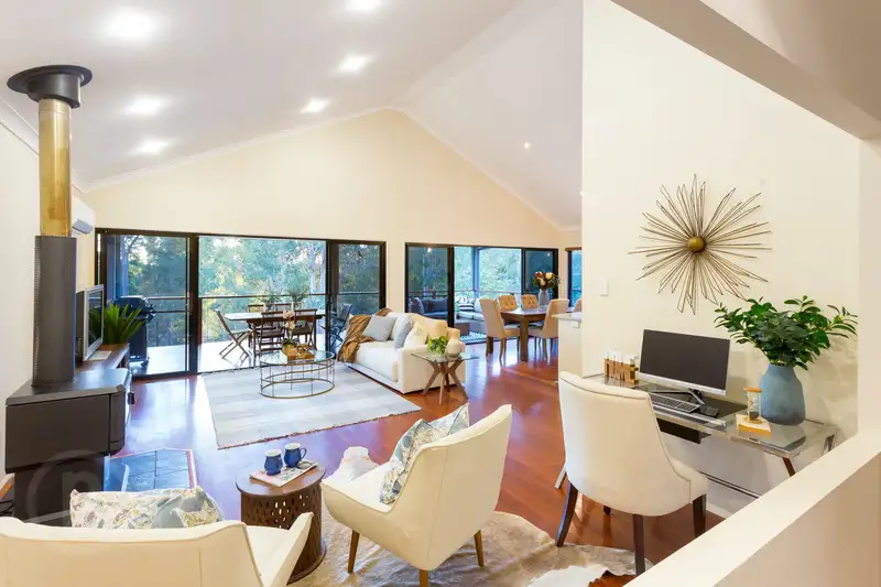 Perfectly positioned to take full advantage of the surrounding elevated landscape, this home offers approximately 2.5 acres of private and peaceful living. From the moment you enter you will be drawn to the natural vista that embraces the home. The light filled interior showcases masterful design drawing in the surrounding landscape. With its soaring ceilings and natural timber flooring, this family home is cleverly designed, with seamless flow to the spacious undercover verandah spanning the rear aspect of the home. Undoubtedly, this will be the focal point for many happy afternoons spent with family and friends while watching the sun go down through the mature trees adorning the property.
